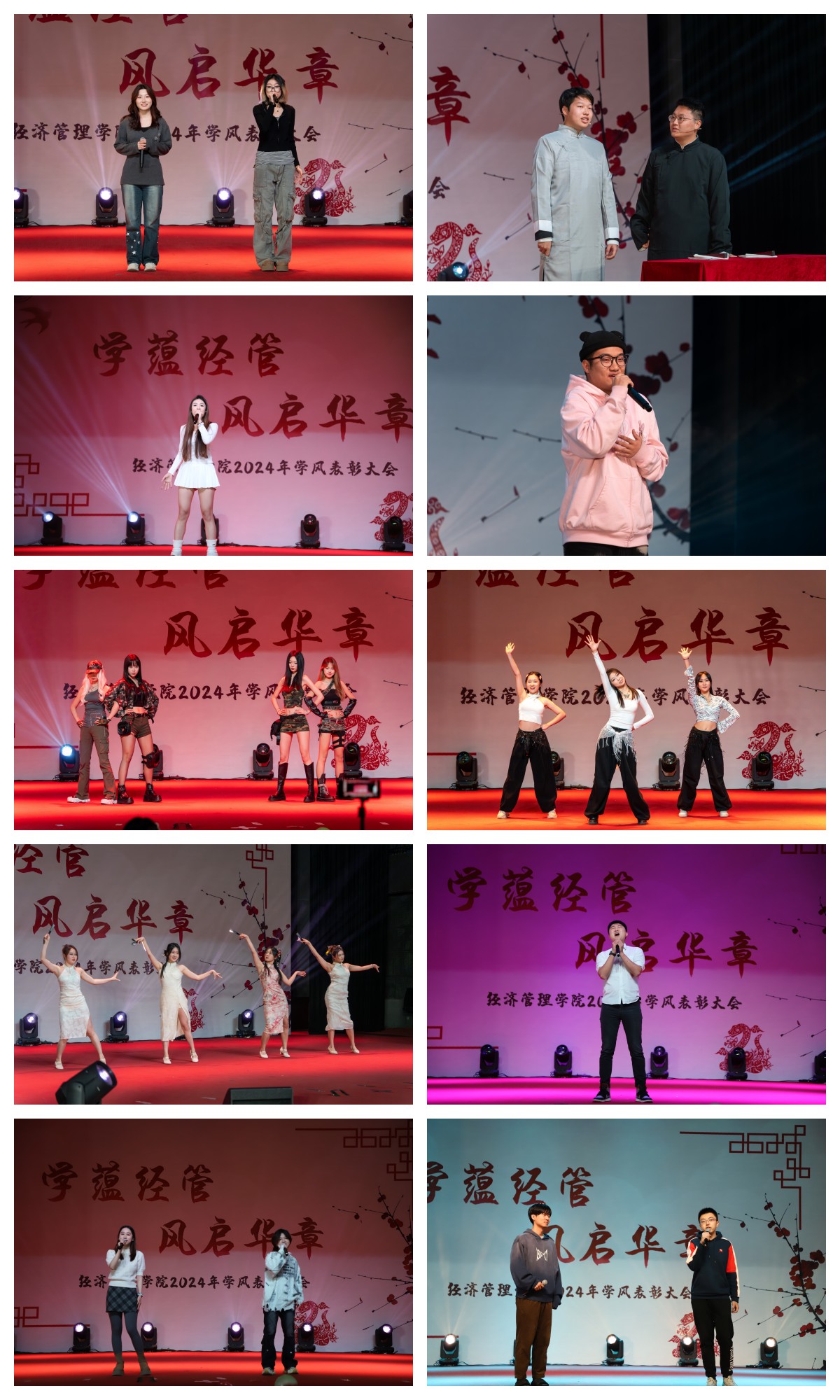活动现场,同学们大展身手,带来歌曲《有我》、独唱《we found love》、独唱《Say Goodbye》、相声《甲方乙方》、舞蹈串烧《whiplash》《Beauty Queen》《夜泊秦淮》、歌曲串烧《简单爱》《二十二》《致青春》,经管团学的同学们带来充满阳光活力的舞蹈《阳光男孩,阳光女孩》。节目精彩纷呈,点燃了同学们心中的热情之火,展现出经管青年无限的活力与激情。