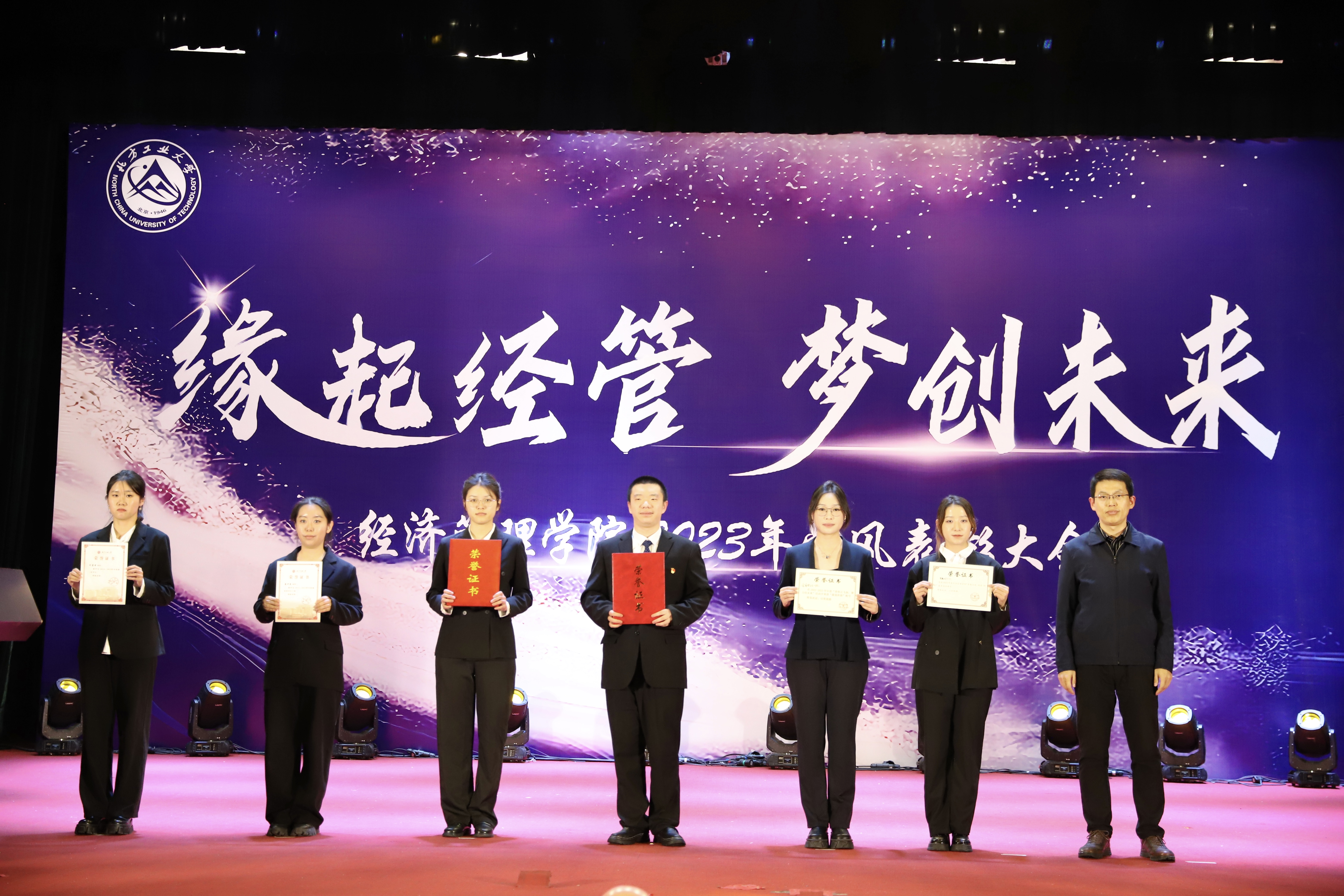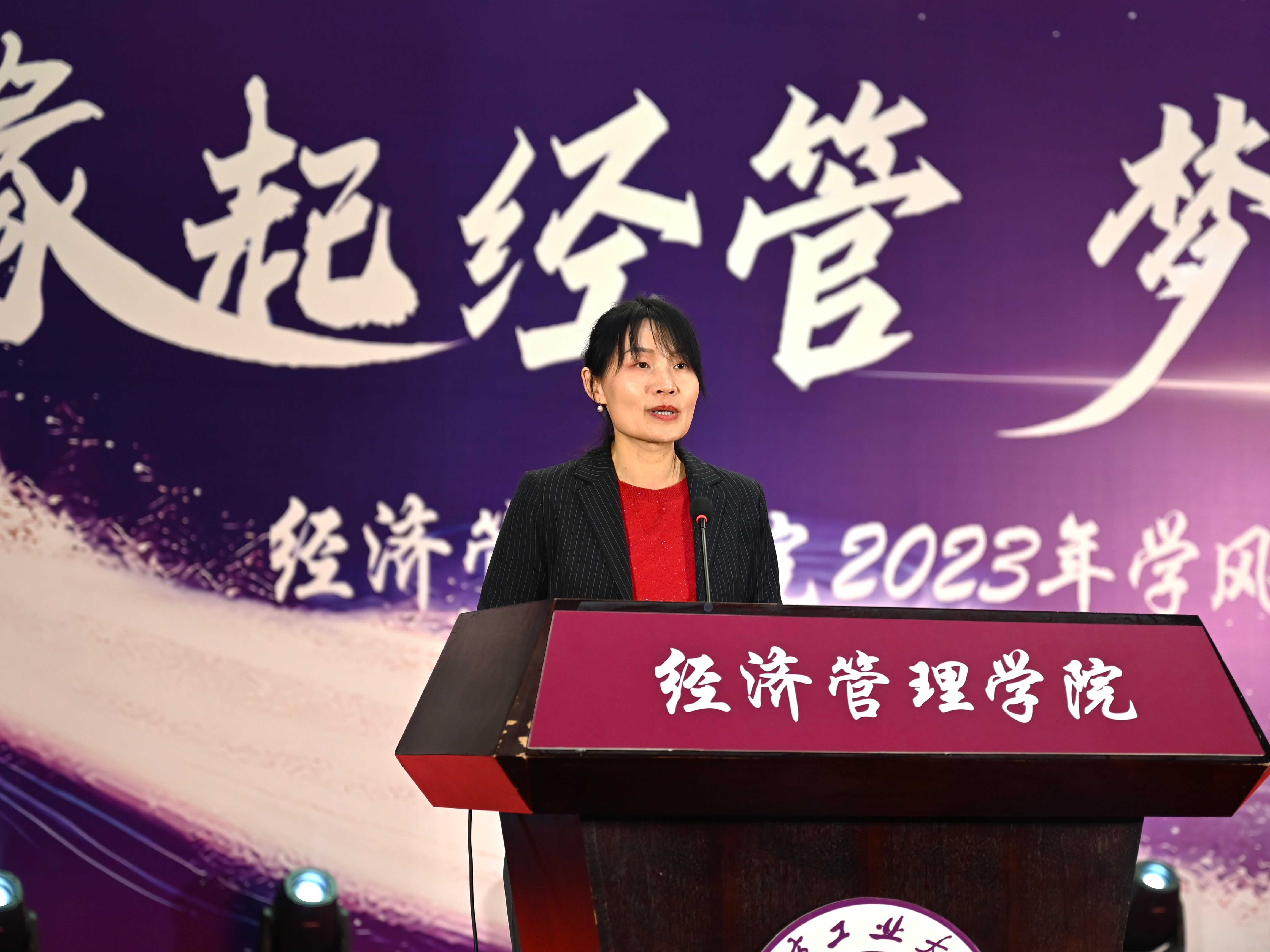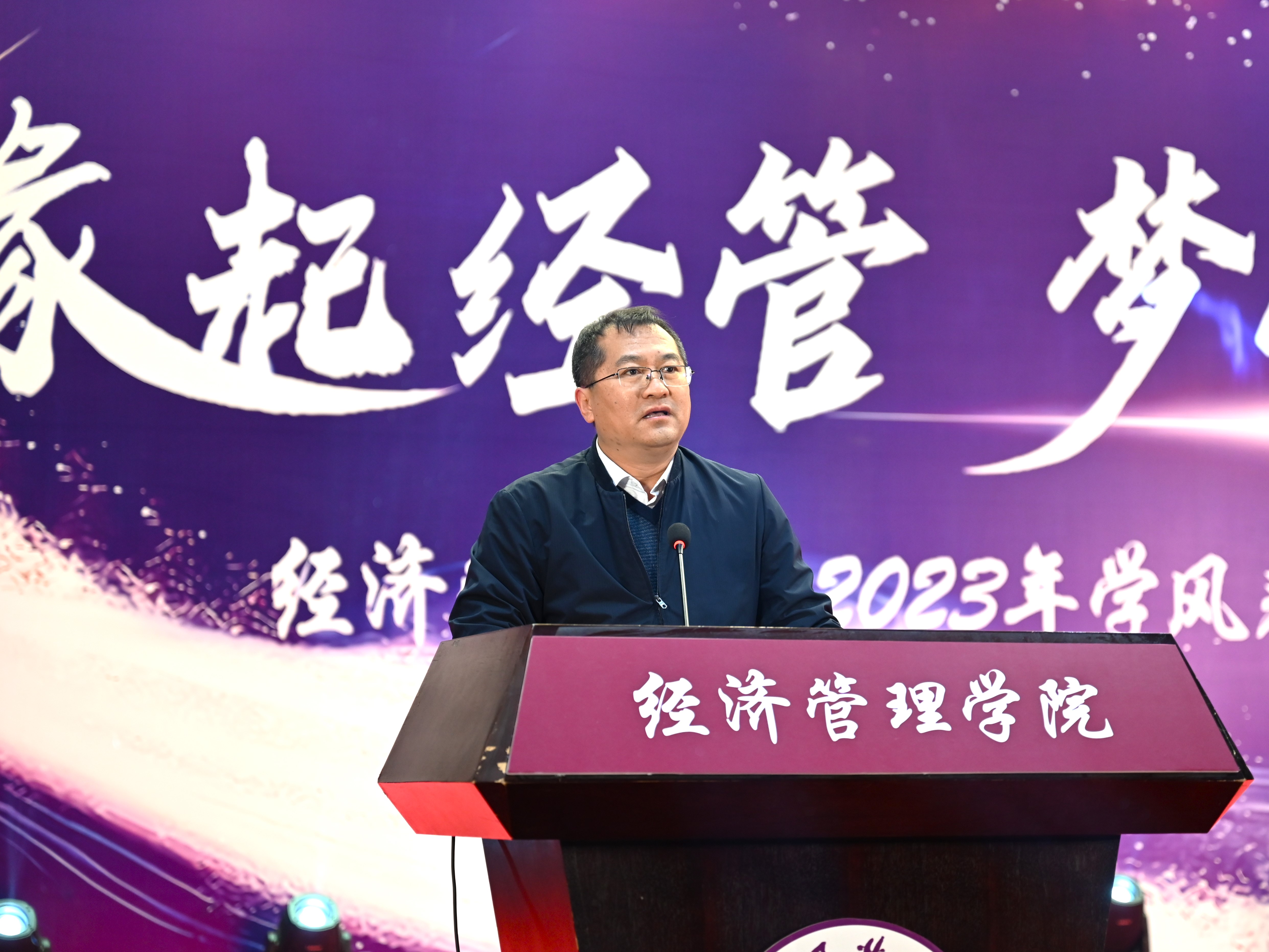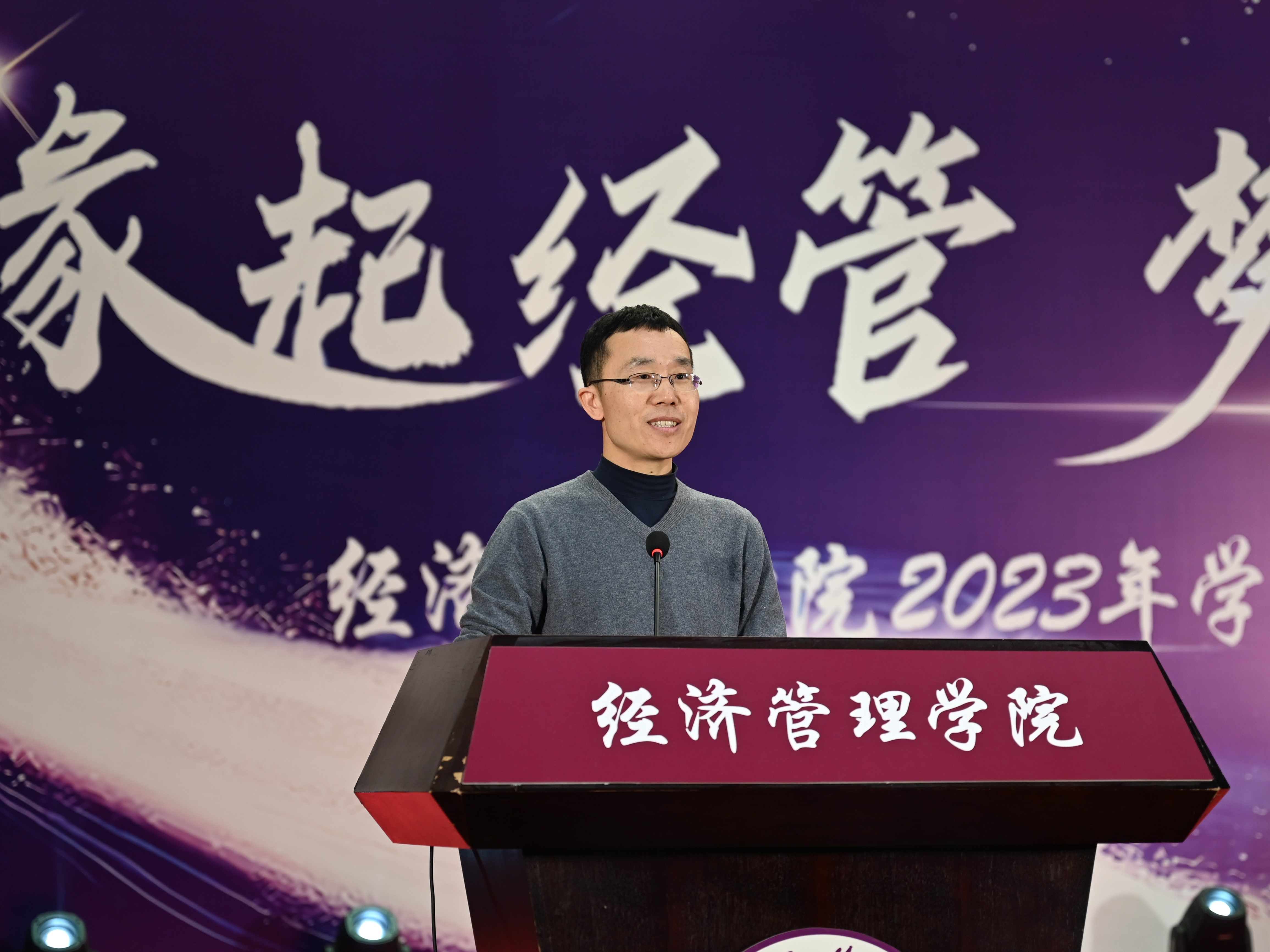 为加强学风建设,总结经验,展现学子风采,激励学院广大师生保持昂扬向上的奋斗姿态,12月14日晚,sunbet在图书信息楼报告厅举办“缘起经管 梦创未来”2023年学风表彰大会。校学生工作部部长孙宗瑞,学院领导班子全体成员,各系主任、班导师、辅导员,22级、23级全体学生参加了活动。