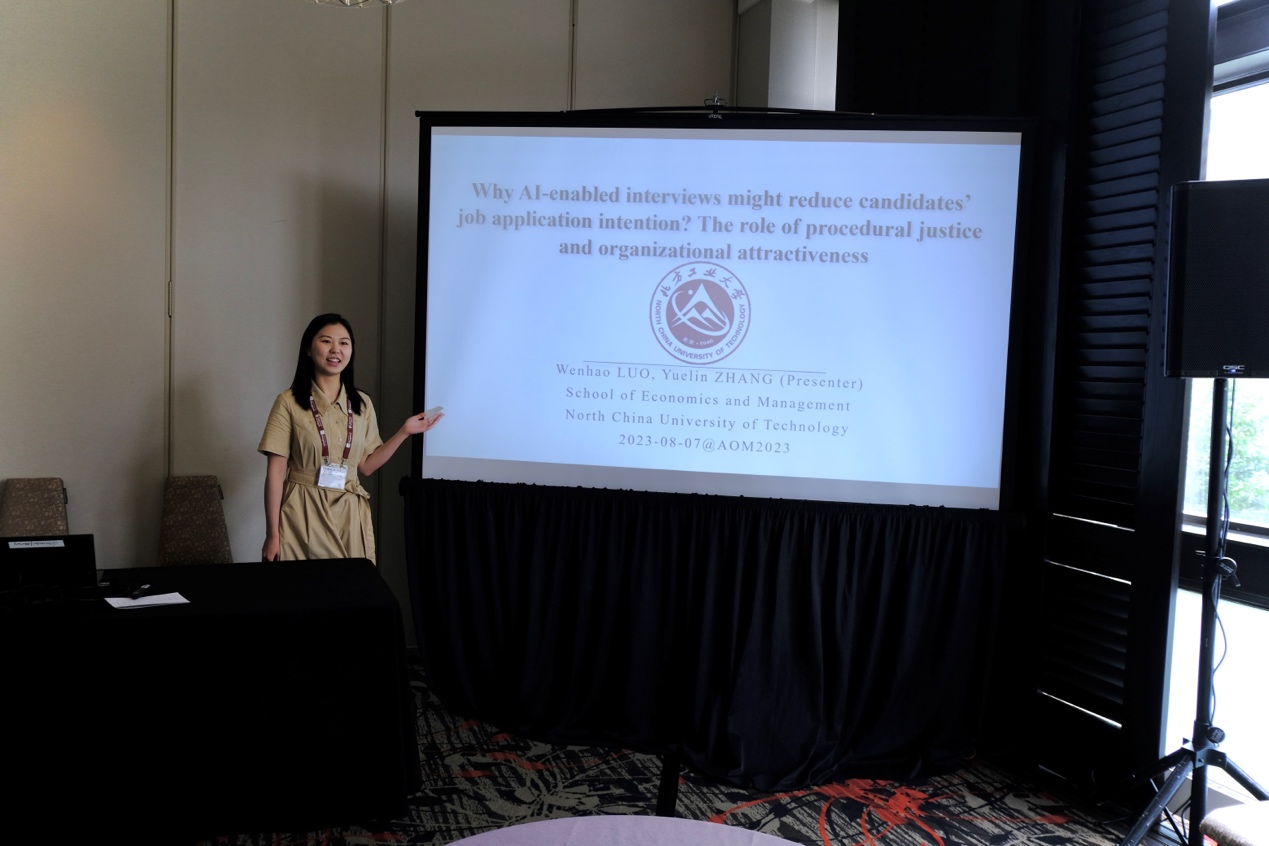 2023年8月4日至8日,第83届美国管理学会年会(Academy of Management, AOM)在美国波士顿举行。我校sunbet罗文豪副教授与其指导的工商管理学科2021级研究生张越琳合著的文章“Why AI-enabled Interviews Might Reduce Candidates' Job Application Intention?”被本次年会接收,并于8月7日在“Artificial Intelligence in HR Decision-Making(人力资源决策中的人工智能运用)”分论坛进行汇报交流。该论文系罗文豪副教授科研团队在人工智能驱动的组织与人力资源管理方向的阶段性研究成果,此次参会得到北方工业大学研究生国际学术交流基金与国家自然科学基金联合支持。