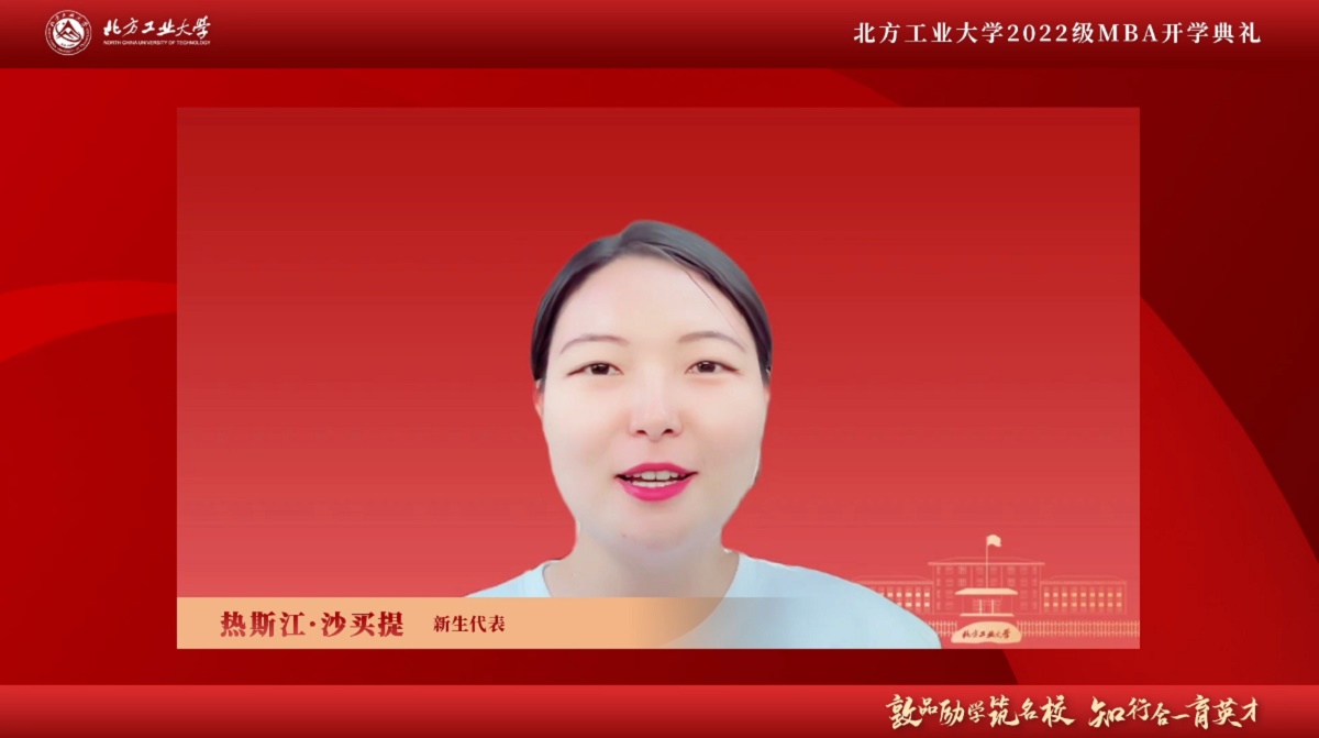 2022级非全日制MBA班热斯江·沙买提同学作为新生代表发言并感谢北方工业大学MBA给自己重回校园学习的机会。她表示,MBA的学习将是自己人生最重要的转折点之一,未来她将常怀求知之心,不断探索突破。同时她也期待与同学们在北方工大MBA的学习过程中见证彼此的努力和精彩,共同度过充实而美好的校园时光。