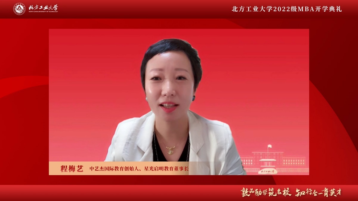 中艺杰国际教育创始人、星光启明教育董事长程梅艺代表校外导师对新加入北方工业大学MBA的94位新生表示衷心祝贺。她表示,十分期待与大家共学、共创、共享。作为校外导师,她将始终如一地关心和支持学院的学科建设、实务创新和人才培养,尽己所能,与学院同心共进。