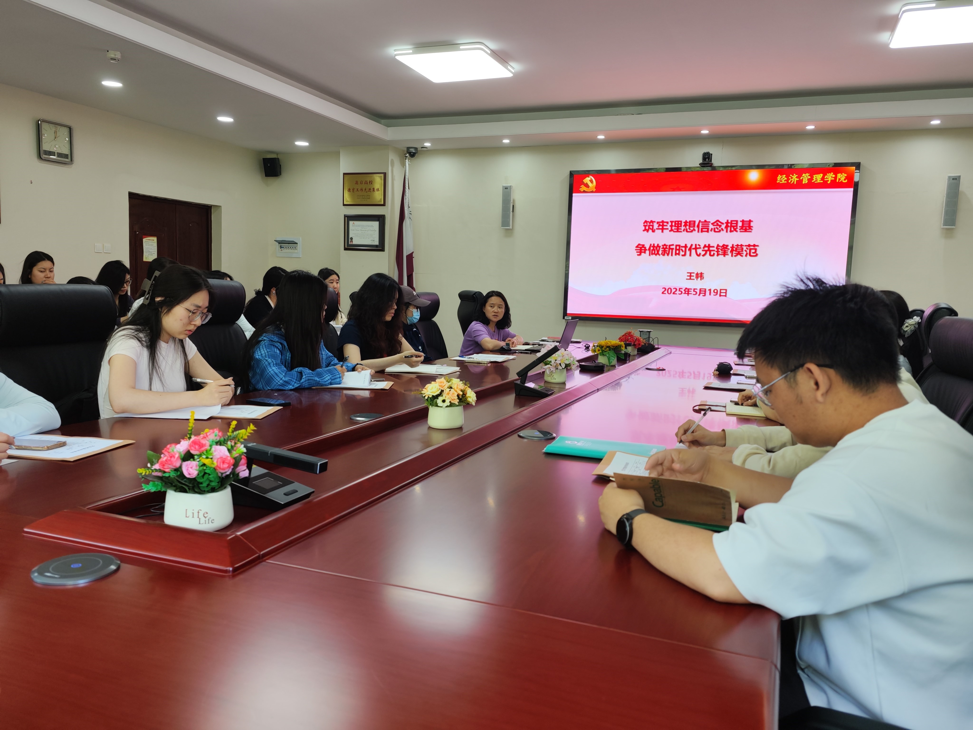 谢朝阳从“人为什么活着”,如何获得幸福感出发,引导同学们要树立正确的入党动机,要明白正确的入党动机绝不是为自己着想、为自己谋私利,而是把党的宗旨放在最高位,国家的利益高于一切。他强调入党不仅仅是一个阶段性的目标,而是一个持续提升自己的过程,只有通过不断的学习增强自己的能量,才能更好地服务他人,发挥先锋引领作用。谢朝阳鼓励同学们要充分发挥经管学子的特质,坚定理想信念,勇担时代使命,继承和发扬经管人的创业精神,成就更好的自己。