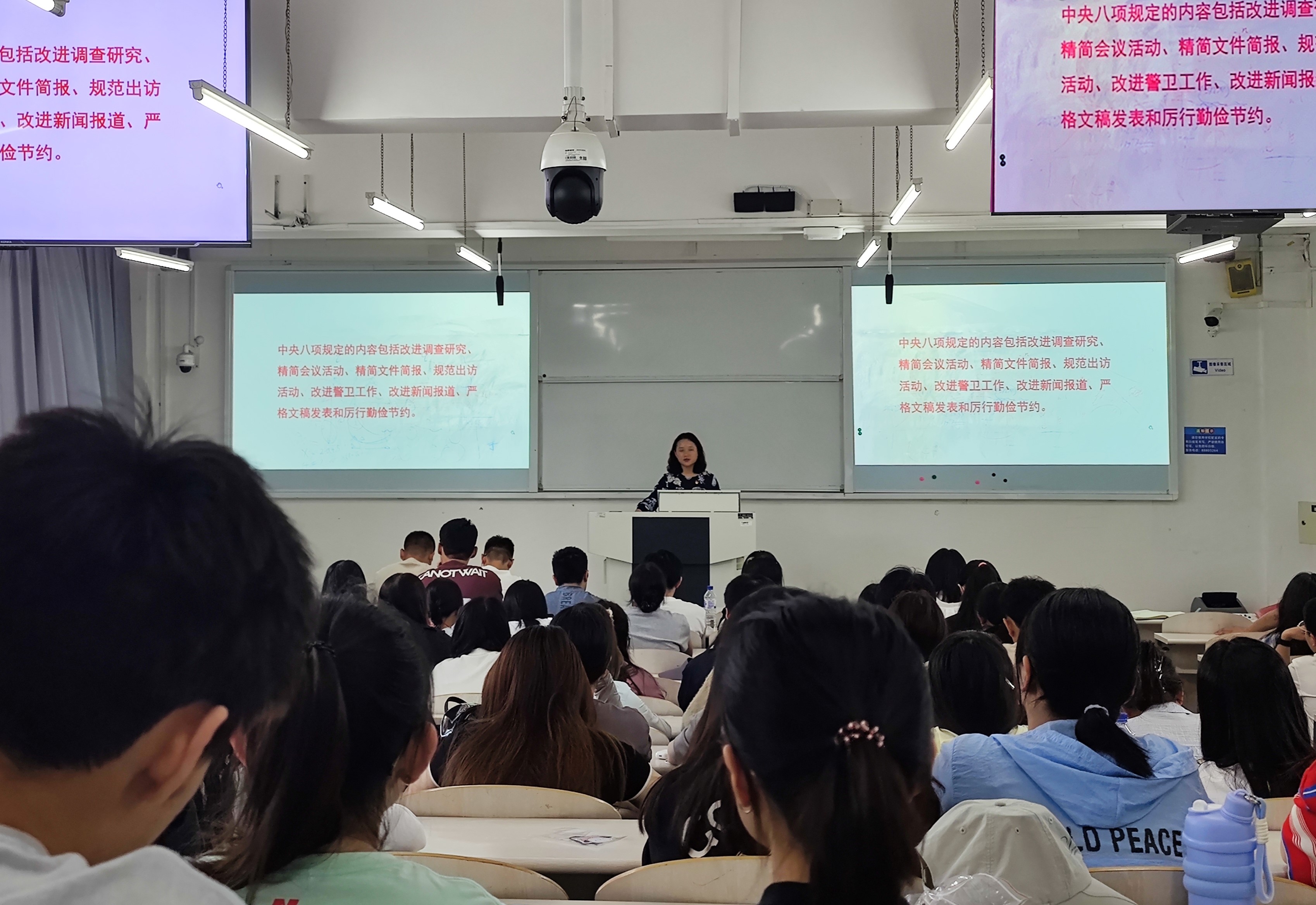 王帏向大家讲解了《习近平关于加强党的作风建设论述摘编》的主要内容,结合警示案例嘱咐同学们,一定要牢记自己的党员身份,始终紧绷纪律之弦,做中央八项规定精神的坚定践行者。她要求毕业生党员要起好模范带头作用,带动身边同学文明离校,要自觉积极融入新的党组织,避免离校即离党。