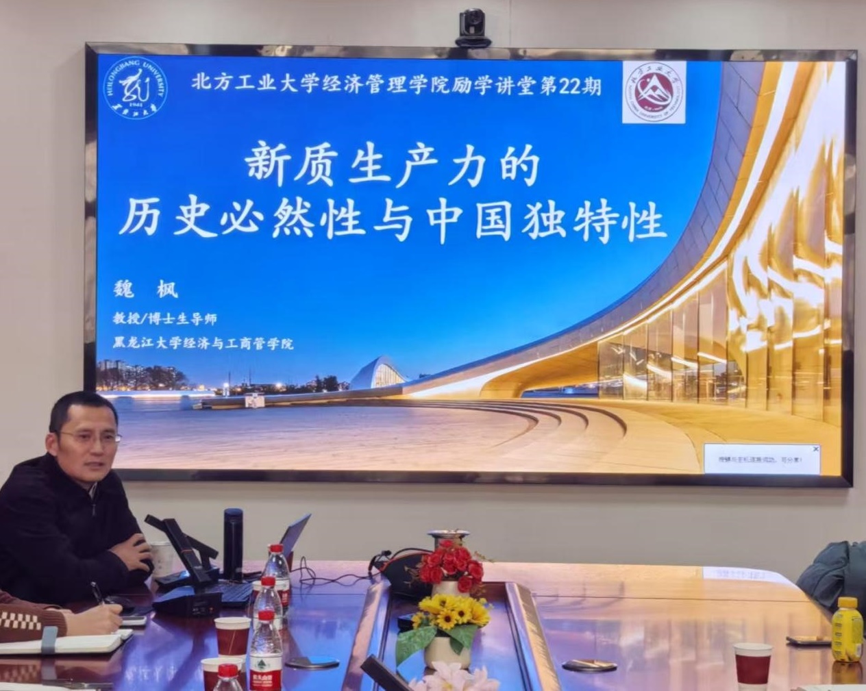12月13日下午,sunbet第二十二期励学讲堂在励学楼201举行。黑龙江大学经济与工商管理学院院长、博士生导师魏枫教授受邀为研究生做主题为“新质生产力的历史必然性与中国独特性”的学术讲座,sunbet谢朝阳书记和赵继新院长参加了此次讲座,科研副院长蒋贵凰教授主持讲座。
