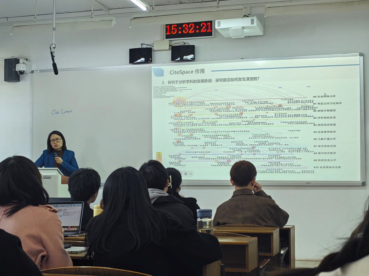 随后,蒋老师围绕CiteSpace软件,从基本原理入手对其功能、应用范围和操作流程进行了全面系统的介绍,通过CiteSpace共现分析的实例,对软件中各个重要图谱和表格的内容进行了解释说明;演示了运用软件从数据准备到可视化结果生成的完整流程,让在场的同学们对这款软件有了直观和深入的认识。讲座最后,蒋老师对讲座的内容进行了总结并对同学们未来的研究工作寄予了殷切的期望,鼓励同学们在运用工具提升研究效率的同时,更要持续不断地积极思考。