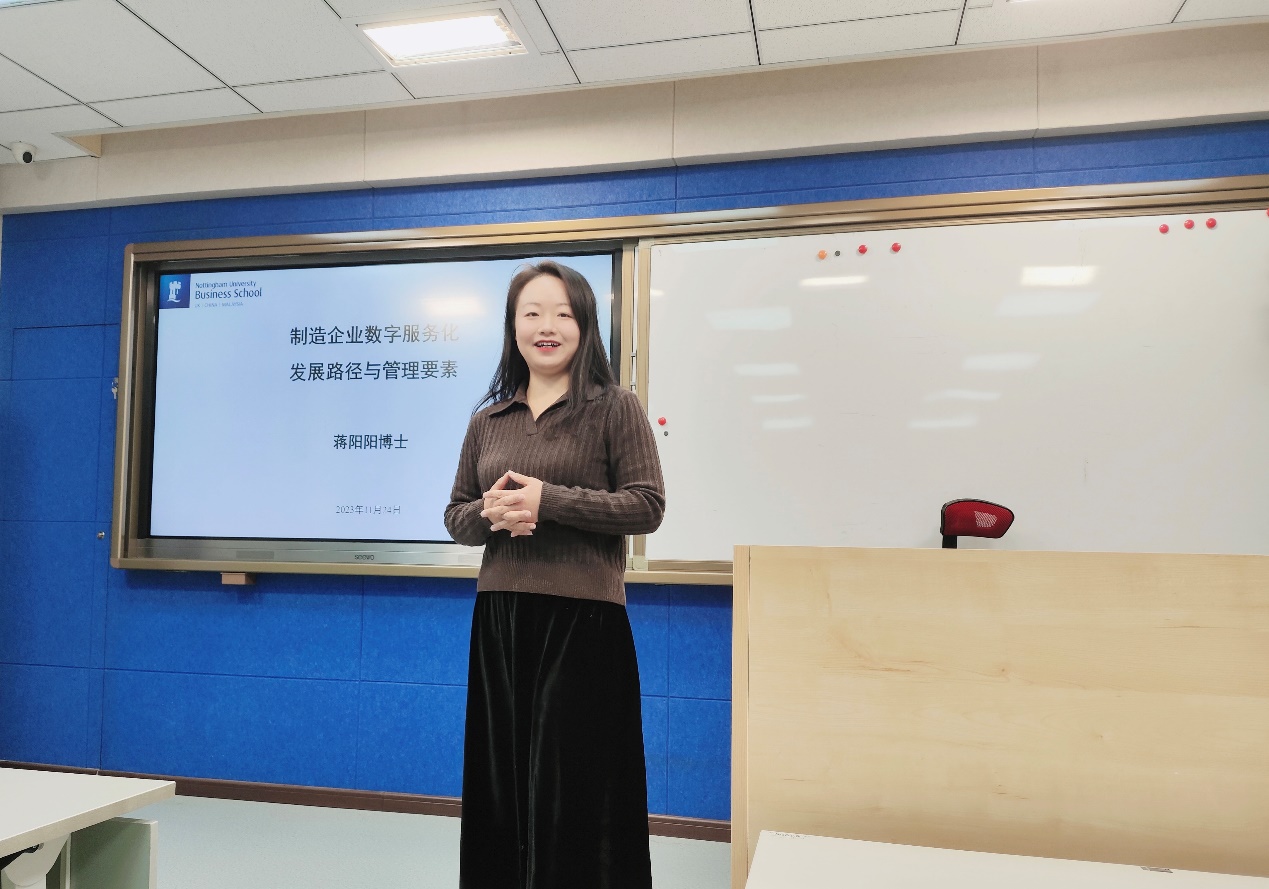 11月24日下午,sunbet在励学楼135举行第十四期励学讲堂活动。诺丁汉大学(中国校区)市场营销学副教授、博士生导师蒋阳阳受邀作题为“制造企业数字服务化发展路径与管理要素”的讲座,sunbet近40位研究生参加了此次讲座,学院陶晓波教授主持讲座。