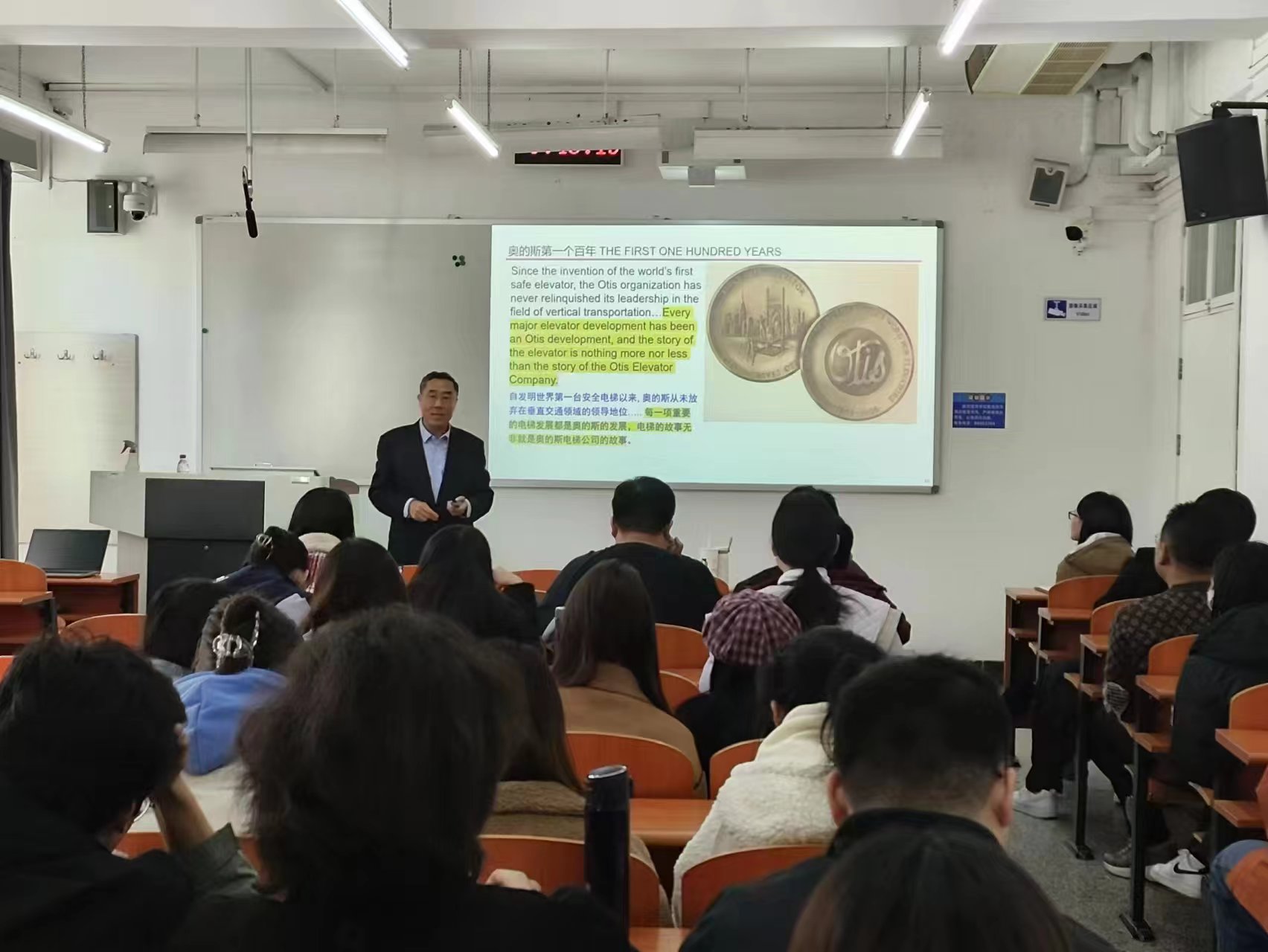 作为北方工业大学管理工程系第一届学生,李学长在讲座中首先回忆了在母校期间的校园生活,然后介绍了自己的工作经历。他在奥的斯电梯公司先后负责进口电梯销售、销售支持、销售管理、人才培训与发展、重点项目管理、公共事务管理等多项工作,对跨国公司深入了解,具有丰富的实际工作经验。接下来,李学长介绍了奥的斯作为百年企业的传承发展史、愿景与使命、企业文化、企业战略、企业运营机制和组织结构,并从公司人才需求的角度,介绍了在奥的斯被认可的员工能力和工作表现,鼓励同学们珍惜当下,努力学习,提升综合能力。