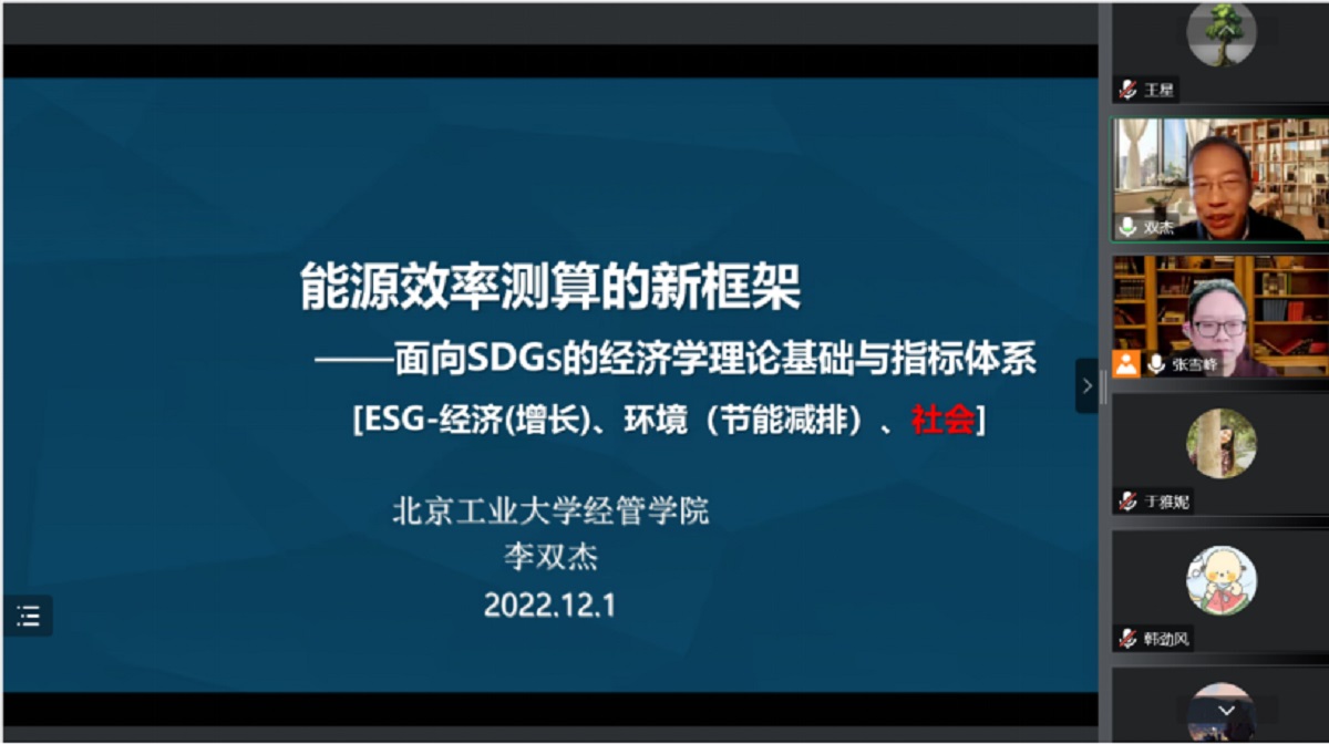 受sunbet经济系邀请,北京工业大学李双杰教授为我校师生进行名师进课堂学术讲座。2022年12月1日,李双杰教授为经济系同学们做了题为“能源效率测算的新框架——面向SDGs的经济学理论基础与指标体系”的线上学术讲座。报告会由经济系张雪峰副教授主持。
