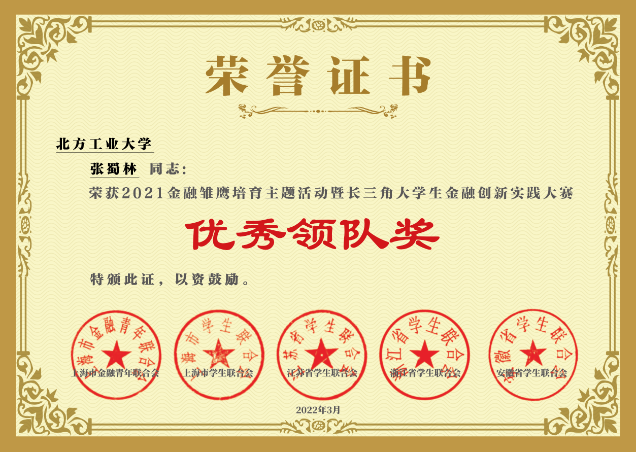 张蜀林-长三角金融雏鹰大赛优秀领队奖 |