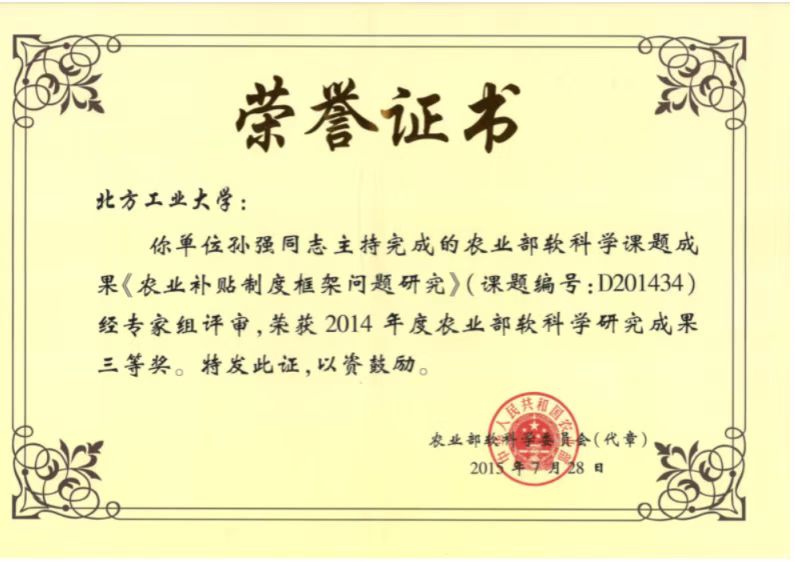 孙强-科研项目成果获得农业部软科学成果三等奖 |