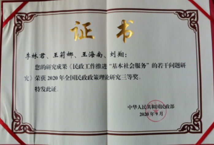 王莉娜-科研成果获民政部三等奖 |