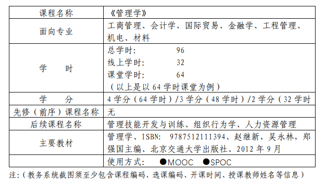 课程与教学改革要解决的重点问题:作为北方工业大学首批上线中国大学慕课网的课程,要解决的重要问题有:(1)线上课程如何进行设计、制作、发布和分享?我们坚持开放共享的建、用、学、管方式,为学习型社会、学习型政党、学习型国家建设提供支撑。如何让我们制作的管理学在线课程让更多的校内学生和社会人士受益是我们面临的重要问题。(2)线下课程如何进行混合式教学的设计、实施和评价?混合式教学对于课程目标、教学内容、教学方法、教学模式、课程评价都提出了新的要求,如何把线上课程和线下课堂结合起来是面临的一个重要难题。(3)教师的教学能力如何向混合式教学转变?混合式教学其实对于传统的教学提出了更高的要求,教师必须首先进行转变,更好地促进提升学生的学习兴趣,让学生成为学习的主体。