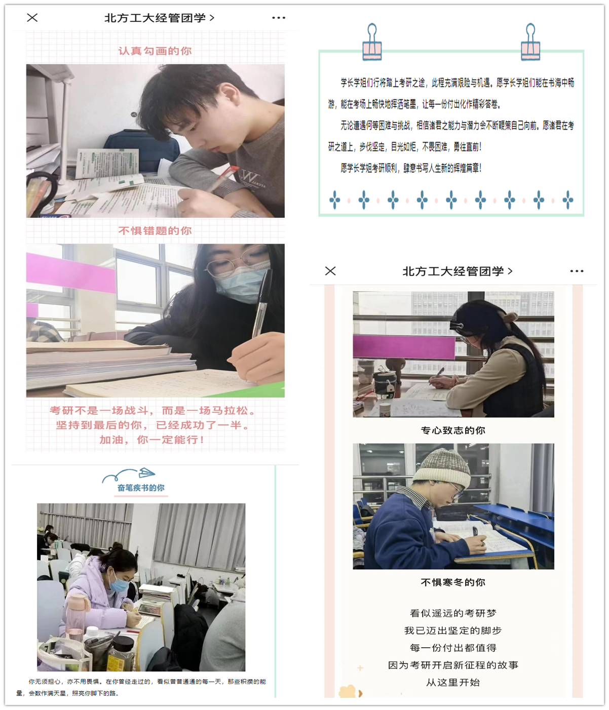 同时,学院团学公众号在考研倒计时最后10天,每天连续推送学长学姐们努力奋斗的模样和学弟学妹们的祝福,并在推送中针对近期考生可能出现的心态调整问题给出了温馨提示,鼓励他们在最后冲刺阶段保持良好心态,全力以赴迎接考试,并预祝全体考生取得优异成绩。