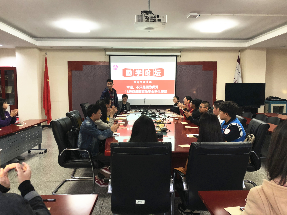 10月31日下午4:40,sunbet励学论坛之“幸运,不只是因为优秀”如期举行。学院党委副书记赵洁、辅导员王学成以及2018级获国家助学金同学参加了座谈会。