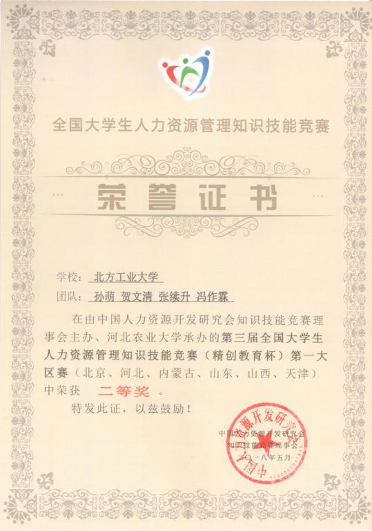 5月5日至6日,在工商管理系魏秀丽、付艳荣和罗文豪老师的组织指导下,我院工商管理专业15级和16级孙萌、贺文清、张旭升、冯作霖四位同学组成“Holly Right”团队,首次代表北方工业大学参加第三届全国大学生人力资源管理知识技能竞赛第一大区赛。该比赛由中国人力资源开发研究会主办,为全国性重要赛事,吸引了近300高校队伍参赛,包括分区赛和总决赛两个阶段。