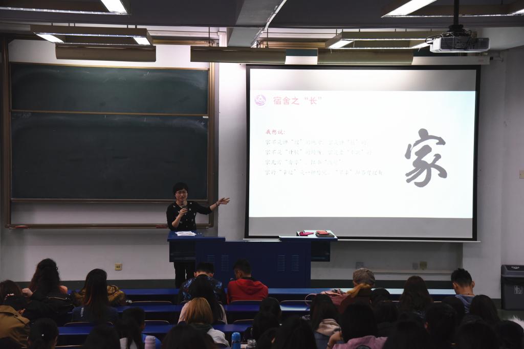会上,赵洁老师以优秀宿舍代表——慧斋429和慧斋303的建设为例,通过视频向大家展现了两个优秀宿舍的成长过程。之后,赵老师从人际关系、宿舍卫生以及未来发展三个方面,向各位宿舍长交流了工作想法,希望大家通过宿舍活动,拉进彼此间的关系;通过宿舍公约,打造温馨高雅的宿舍环境;通过取长补短,共同促进提高。最后,赵老师向大家通报了学院开展"最美宿舍"评比活动的通知。