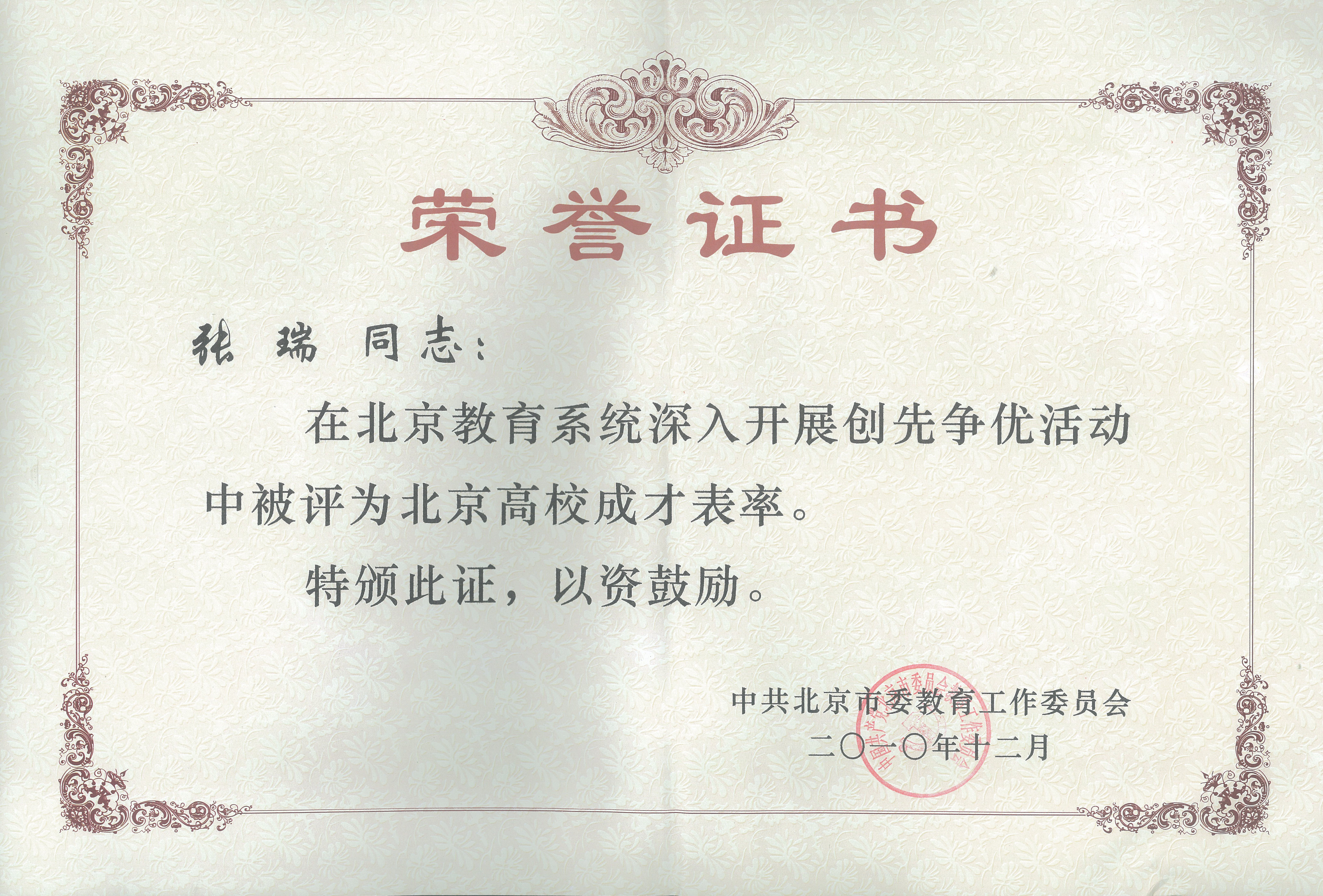 张瑞,1989年出生,2009年加入中国共产党,sunbet国际经济与贸易专业07A-3班学生,曾获北京市三好学生、校级三好学生、校级优秀共青团员、校级“成才表率”等荣誉称号。