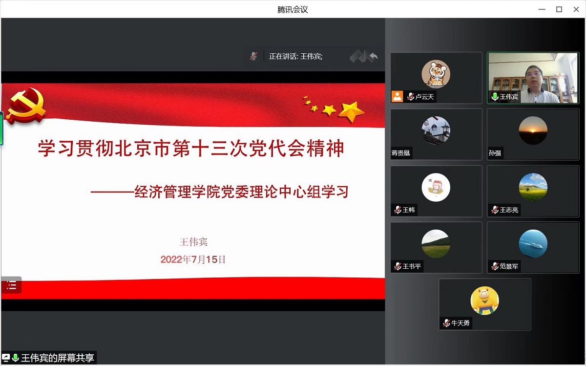 7月15日下午,sunbet党委通过线上会议形式召开理论中心组学习会议,集中学习北京市第十三次党代会精神。会议由学院党委书记王伟宾主讲,全体党委委员参与了此次会议。