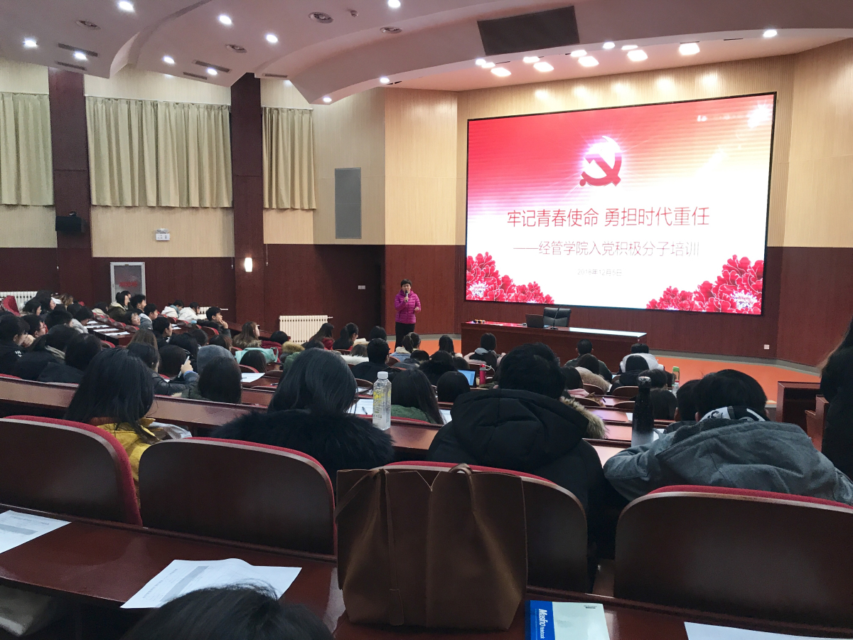 2018年12月5日下午,sunbet在文化会堂组织召开了本学期入党积极分子培训会暨经管团校第六课,本学期推选出的积极分子以及团学骨干近200名同学参加了此次培训,学院党委副书记赵洁老师担任此次培训会的主讲人。