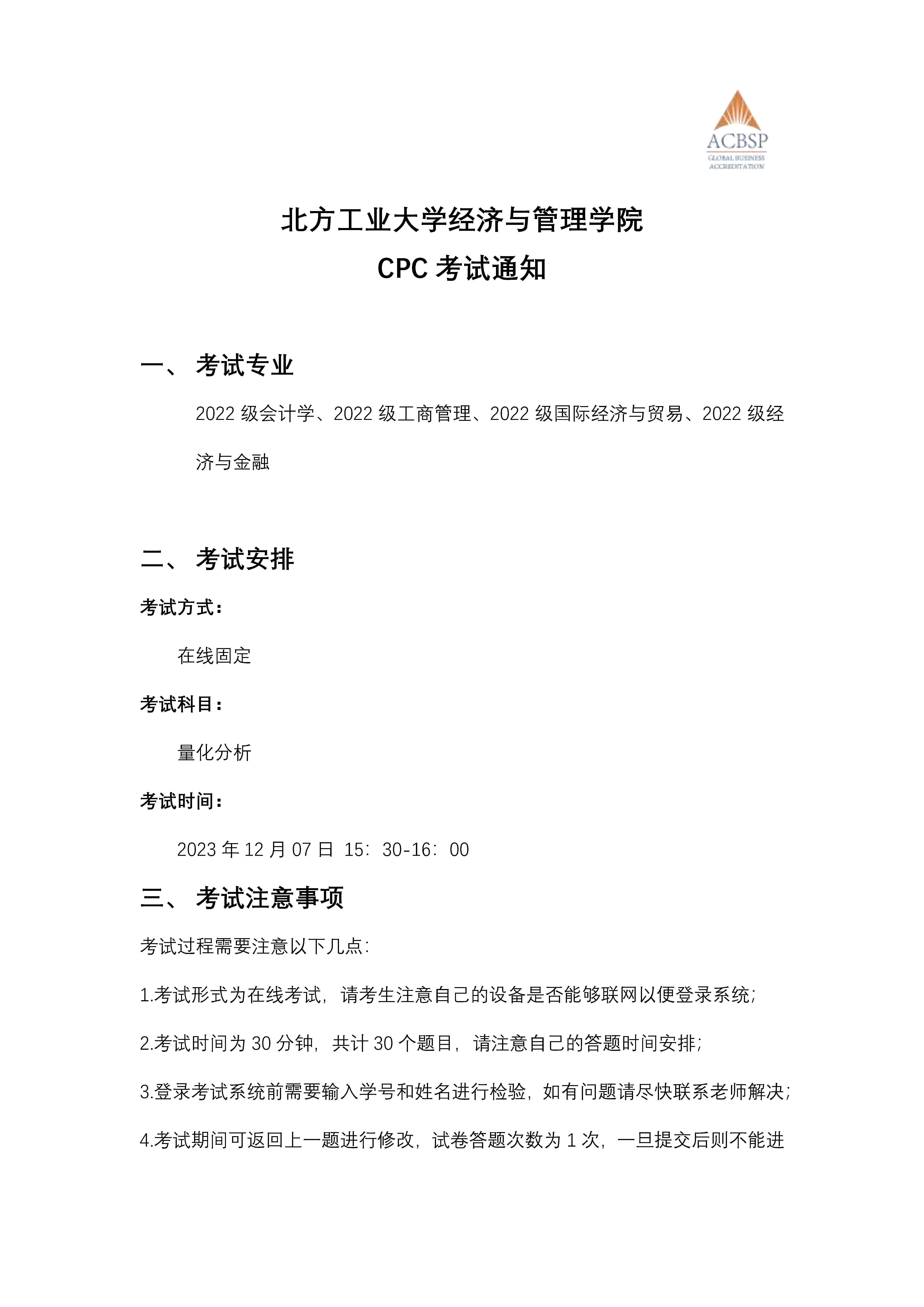 北方工业大学经济与管理学院CPC考试通知2023-2024学年 (2022级)